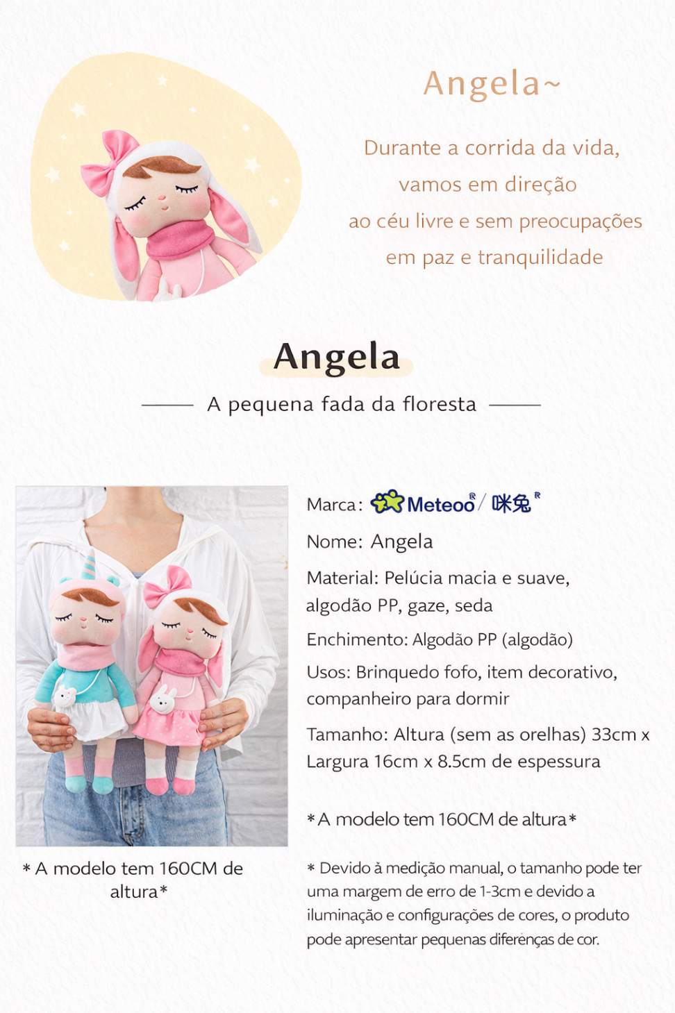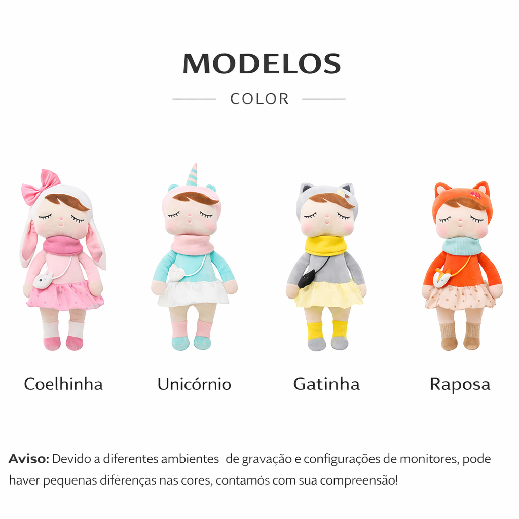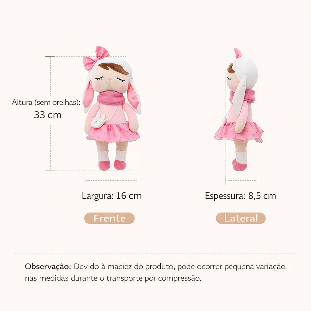 A Boneca Metoo combina um design delicado com toque extremamente macio, sendo ideal tanto para brincar quanto para decorar ambientes infantis e até mesmo de adultos.